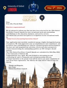 It is with great pride that we, the Jury Team of the Oxford Excellence Council, extend our sincere congratulations to Prof. Dr. Paresh Shah on being conferred the “Global Icon in Accounting Innovation Award” at the 15th Oxford Excellence Council, held in association with the University of Oxford.